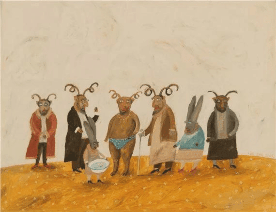 “The paintings are inspired, among others, by well-known literary works, stories, legends, and often famous film stars, celebrities, or mythical figures. For example, you also have the anthropomorphic Mr. Rabbit from Lewis Carroll’s Alice story. The surreal underworld of the stories created by Lewis Carroll, the bizarre and grotesque adventures and characters, and the mystery and hidden meaning typical of his fiction appear in every detail of the paintings.”(Victoria Rosenstein) (Men meeting on the Street)